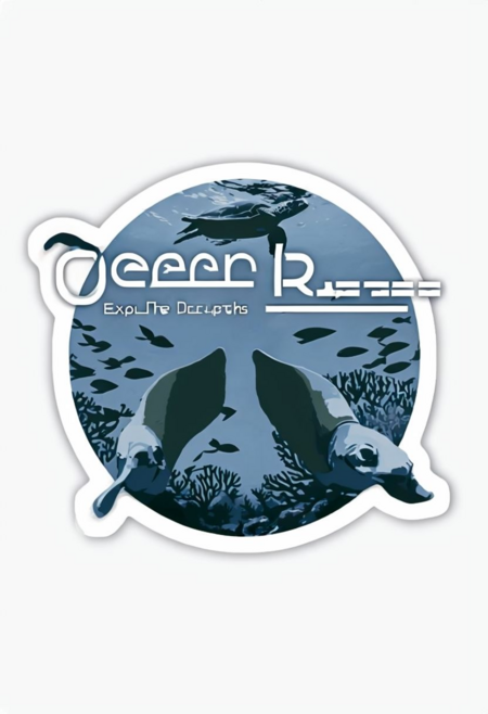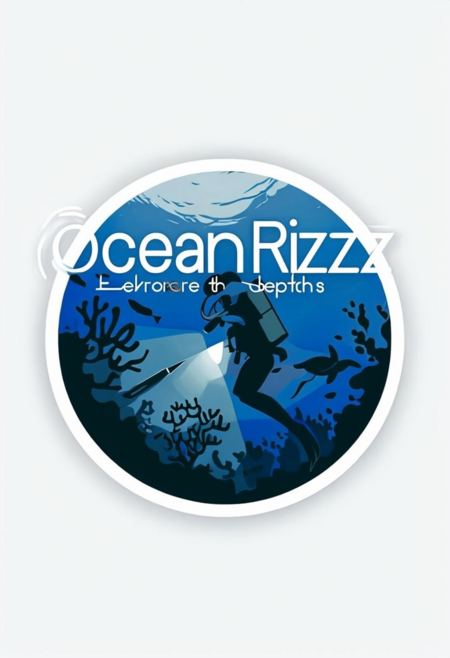 Промт: Generate minimalistic vector sticker with «Ocean Rizz» featuring diver and underwater life. Use grey, blue and dark blue tones.