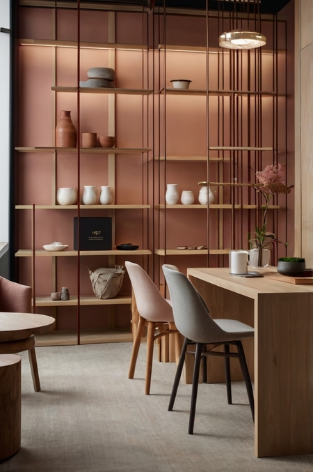 Promt: Design a modern and serene office interior for the Japanese kitchenware brand «Kitchin», blending Japandi aesthetics with a professional workspace. The space should reflect the brand’s values of mindfulness, simplicity, and refined taste. Use a warm and earthy color palette: deep terracotta red (C9B7AD), and charcoal grey (#0D0D0D). Incorporate natural materials like wood, stone, and textured fabrics. The office features clean-lined furniture, a spacious wooden desk, ceramic decor items, and a tea corner with minimalist accessories. Branding is subtle — the «Kitchin» logo appears on the wall or glass partition. Lighting is soft and ambient, contributing to a calm, focused atmosphere. The layout is uncluttered, with thoughtful use of shadows and textures.