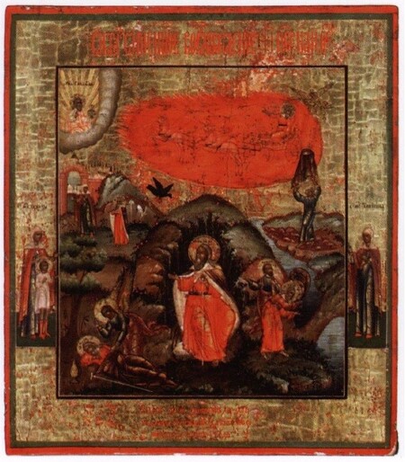 Здесь мы видим в центре иконы мы видим крупную фигуру пророка Ильи в пустыне, окруженную маленькими клеймами, изображающими моменты его жития, включая сцену огненного восхождения. Такая иконография сформировалась в первой половине — середине XVII века в Центральной России. Вместе с изображением огненного восхождения в клейма обычно включались сцены явления Ангела спящему Илье, перехода через Иордан, жертвоприношения, а также момент, когда пророк Елисей ловит милоть Ильи. Уральские иконописцы привнесли в традиционную схему новый сюжет. Вместо сцены жертвоприношения тельца на горе Кармил в верхнем левом углу иконы они начали чаще изображать встречу Ильи с вдовой у стен города Сарепты. Илья обычно изображается сидящим на пне, а вдовица, собирающая дрова, полуповоротом обращается к пророку. Наличие данного клейма отличает эти иконы от произведений других старообрядческих центров и является характерной чертой уральской иконографии.