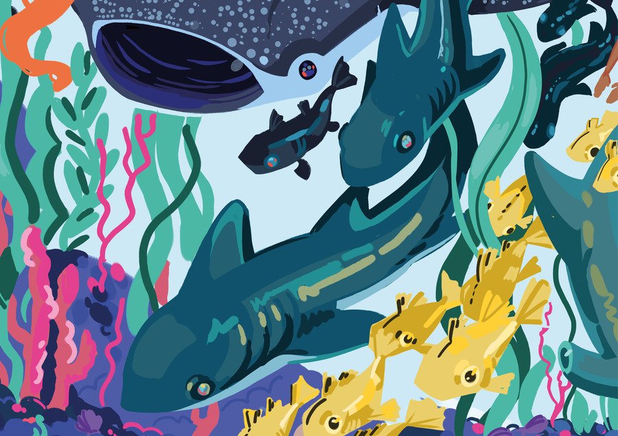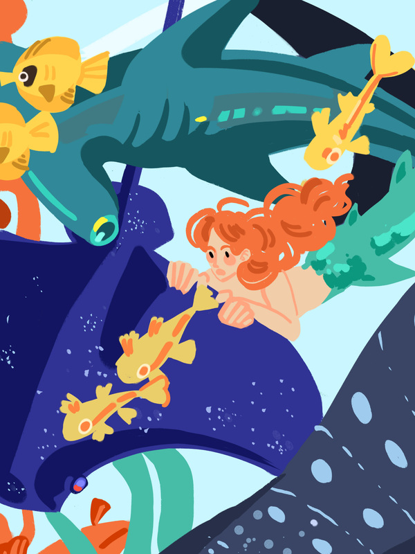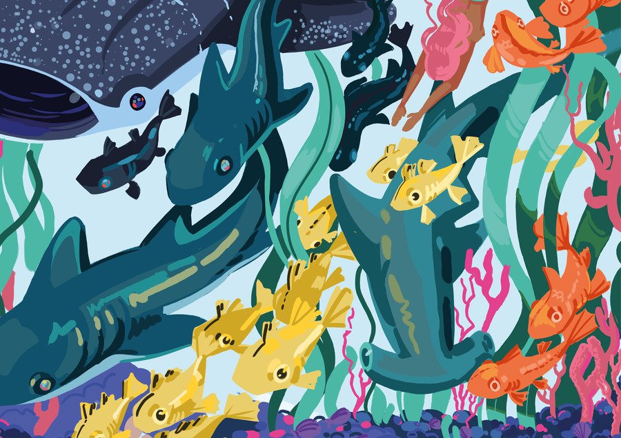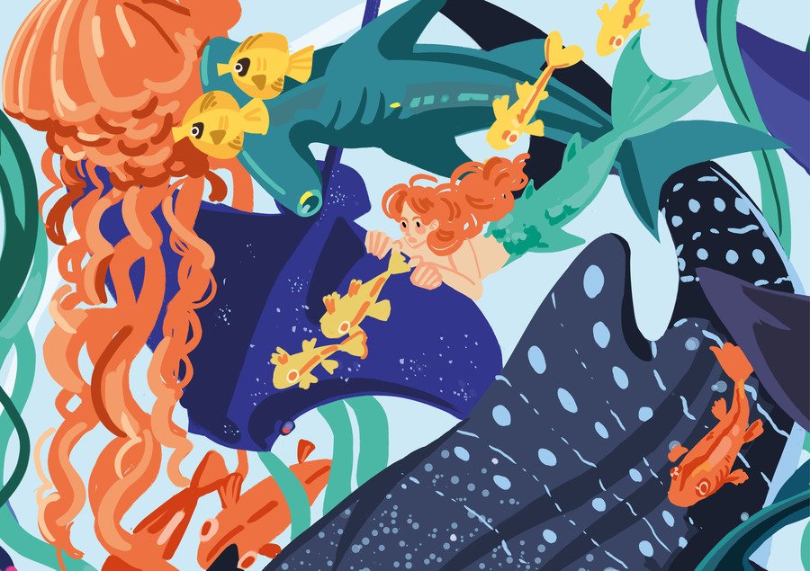 Фэшн-принт переносит зрителя в удивительный подводный мир, полный самых разных морских животных, растений и мифических существ.