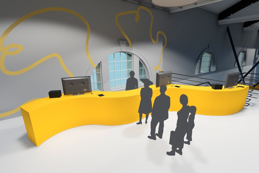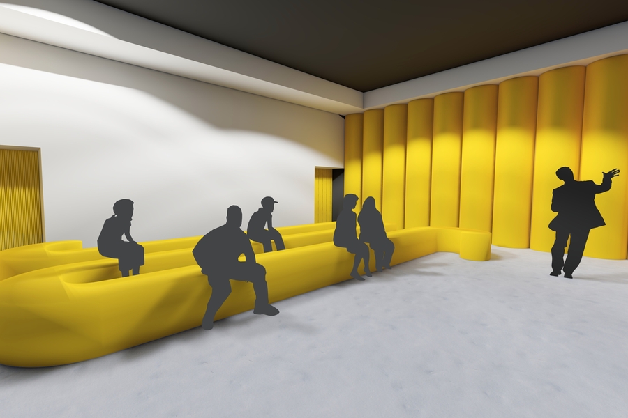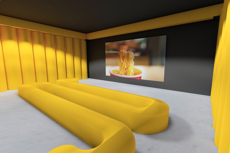 Promt: Create a creative interior for the exhibition at the museum of instant noodles called «Oh my noodle!» in yellow shades.