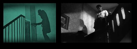 The films also share an architectural lexicon that shapes narrative affect. Expressionist cinema frequently uses staircases as unstable transitional spaces, as in The Golem or Nosferatu, where the ascent or descent marks the approach of danger. Noir reinterprets this motif to emphasize moral descent. In Spellbound, John Ballantyne descends the staircase in a trance, razor in hand, suspended between innocence and potential violence.