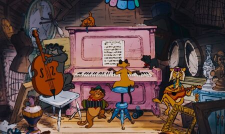 Сцена джема в подвале с песней «Ev’rybody Wants to Be a Cat» — это кульминация джаза в мультфильме. Аниматоры визуализируют музыку через ритмичное движение: персонажи импровизируют, их тела пластично изгибаются в такт, а весь кадр пульсирует энергией свинга. Композицию создали Флойд Хаддлстон и Эл Ринкер. Её аранжировка и исполнение — заслуга Скэтмена Крозерса, который озвучил Сэт Кэта. Его уникальный скэт-вокал добавил номеру аутентичности и джазовой глубины.