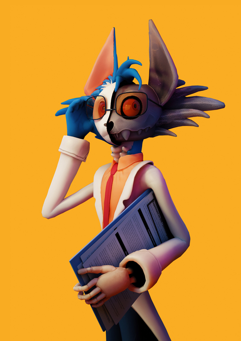 Скотт — стилизованный котик. В первых версиях левая половина головы должна была иметь только череп. Но, чтобы сбалансировать силуэт, ухо и мех также были стилизованы под кость.