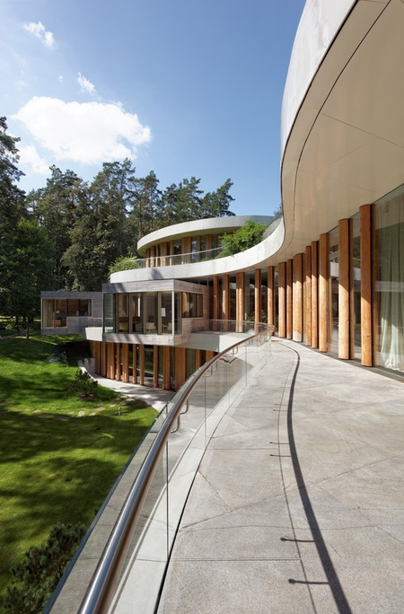 Загородный дом «Блины», Московская область, 2001 — 2006 «В этом проекте мы изменили традиционные функциональные схемы и сценарии жилого пространства. Хотели „заставить“ жителей дома жить по-новому, не совсем привычному сценарию. Пятно застройки мы рассматривали как поляну, на которую бросили функциональные блоки как кости. Они небрежно рассыпались и получилась деревушка вокруг очага. Деревянными столбами прочертили границу и обозначили пространство, внутри которого происходит жизнь. Внутри „колышков“ — тепло, а за „колышками“ — холодно. Как в детских классиках — внутрь черты прыгнул: „Я — в домике!“. Дом „Блины“ об этом».