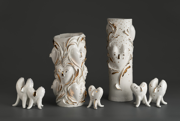 Porcelain vases «Faces» are two functional objects made using hand-molding technique and painted in gold. The composition is complemented by figures from the «hearts on legs» series. The idea for the work came from lonely evenings and longing for friends who now live far away. I wanted to capture images that remained in my memory (on vases) and real images (figurines).