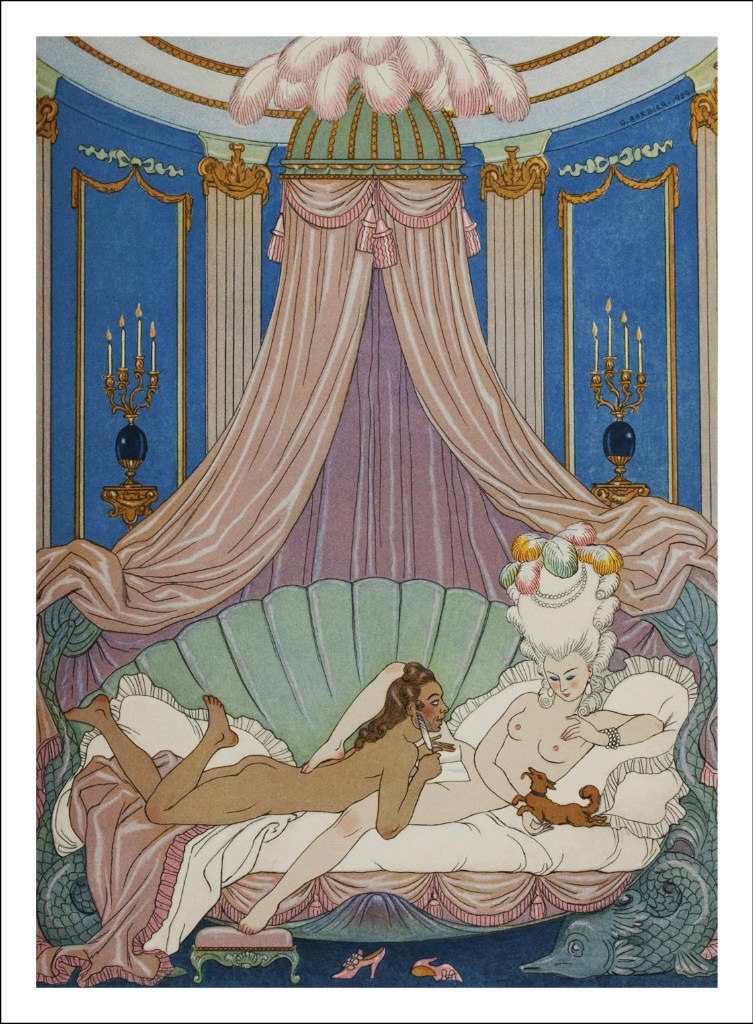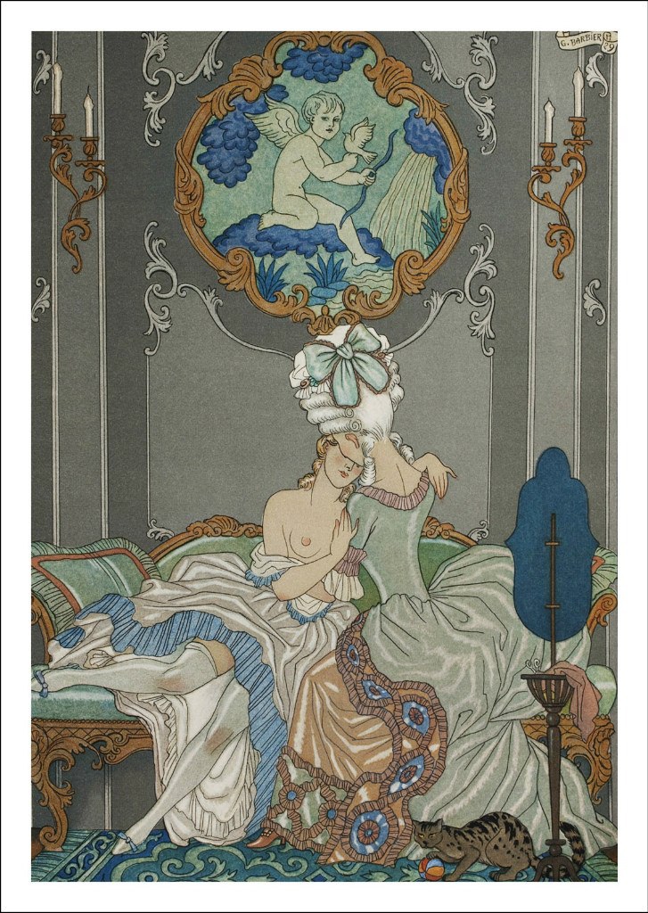 Жорж Барбье проиллюстрировал такие романы, как «Опасные связи» и «Дважды любимая». «Опасные связи» — французский эпистолярный роман Пьера Шодерло де Лакло, впервые опубликованный в 1782 году. Произведение известно критикой нравов французской аристократии того времени и исследованием тем власти, сексуальности и морального разложения. «Дважды любимая» — французский роман Анри де Ренье 1900 года. Главный герой — граф Николай де Галандо, замкнутый и оторванный от жизни «вечный девственник». Всю жизнь он ждёт единственную и неповторимую любовь, которая занимает все его мысли и чувства. Фривольность в иллюстрациях по отношению к историзму и достоверности, образы интерпретируются через призму ар-деко, и используется только сюжет, где Александрия становится Парижем 1920-х. Героини изображены как нимфы с томными взглядами, показаны интимные сцены купания, массажа, сна, сцены эротизированы и откровенны. Историзм, как и экзотика, становится мотивом; жанром, возможным для интерпретаций.