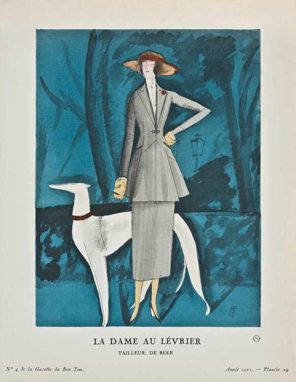 После открытия гробницы Тутанхамона в 1922 году борзая салюки (персидская борзая или русская псовая), фараонова собака (внешне похожа на образ Анубиса, которую тоже иногда относят к борзым) часто появляются в фэшн-иллюстрации. Борзые ассоциировались с королевской охотой, особенно в России и Англии, аристократией. На иллюстрации они повествуют об элитарности хозяйки (как элемент роскоши). Другие элементы роскоши, такие как автомобили, лошади, увлечение авиацией, гольфом, яхтингом прослеживаются и в иллюстрациях Эдуардо Бенито, Чарльза Мартина, Леона Боннота и отражают общую тенденцию к ней.