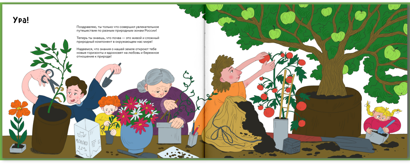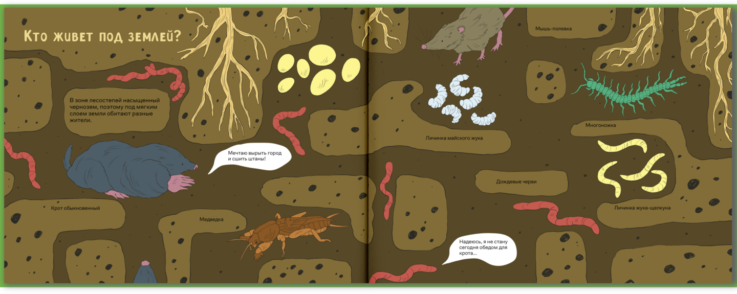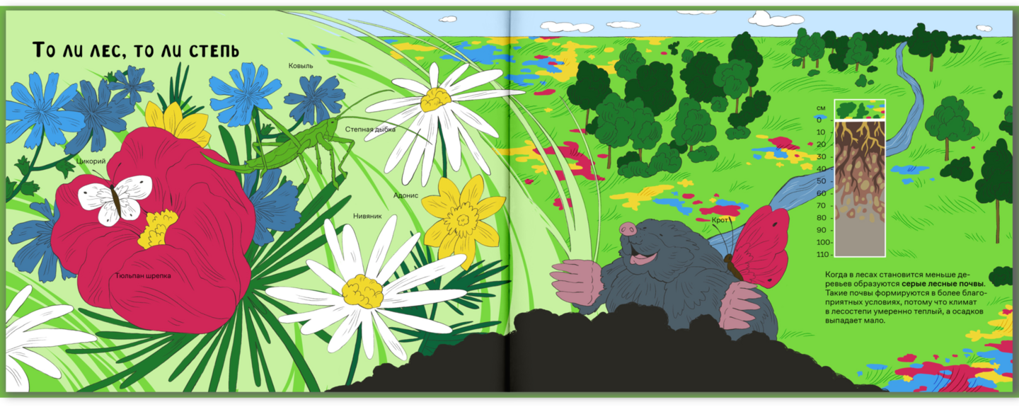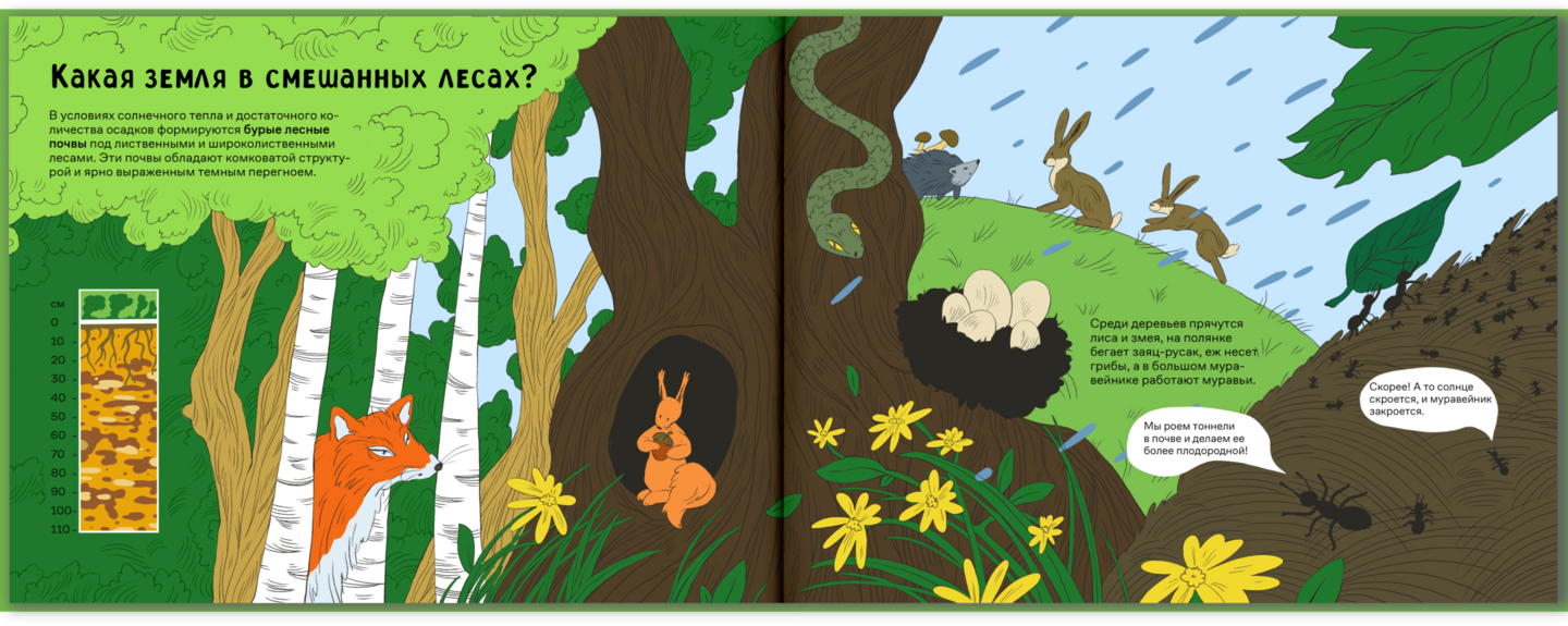 Мне было важно сохранить энциклопедический стиль книги, поэтому в текст введены различные тематические термины, а иллюстрации включают в себя инфографику в виде схемы среза почвы.