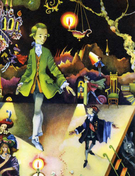 В первой иллюстрации мы можем увидеть элементы похожего на Босха подхода к композиции, взаимодействию цвета и освещению, что добавляет некоторой мрачности, такой драматичной и контрастной для детской сказки.