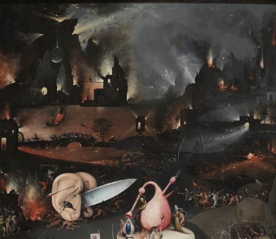 В этой работе можно увидеть сходство с Босхом уже не в цвете, но в сюжете и композиции — страдания маленьких человечков и множество мелких деталей, однако в таком ярком представлении впечатление становится совсем другое.