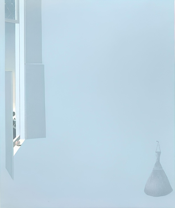 Здесь первоисточник не так просто узнать сразу, лишь при внимательном рассмотрении мы понимаем, что автор убрал все, оставив лишь несколько деталей — яблоко из предметов повседневного обихода и веник, который тоже является таким предметом, просто как будто из другой комнаты, и конечно, небо — важная часть отражающая внутренний мир одинокого человека.
