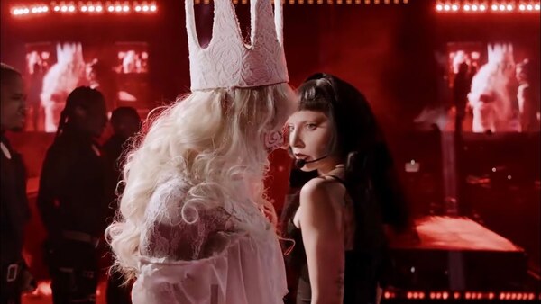 Начиная с первого акта, перед зрителем восстает «злая» сторона певицы. Открывающая сцена поражает: огромное платье- клетка, на вершине которого восседает злая Леди, а под юбкой заключены девушки, своими костюмами напоминающие ведьм из средневековия. Сам костюм отсылает к платьям викторианской эпохи: пышное, с множеством мелких складок и деталей. Конструкция в целом, демонстрирует величие и пафосность злой Леди в красном.