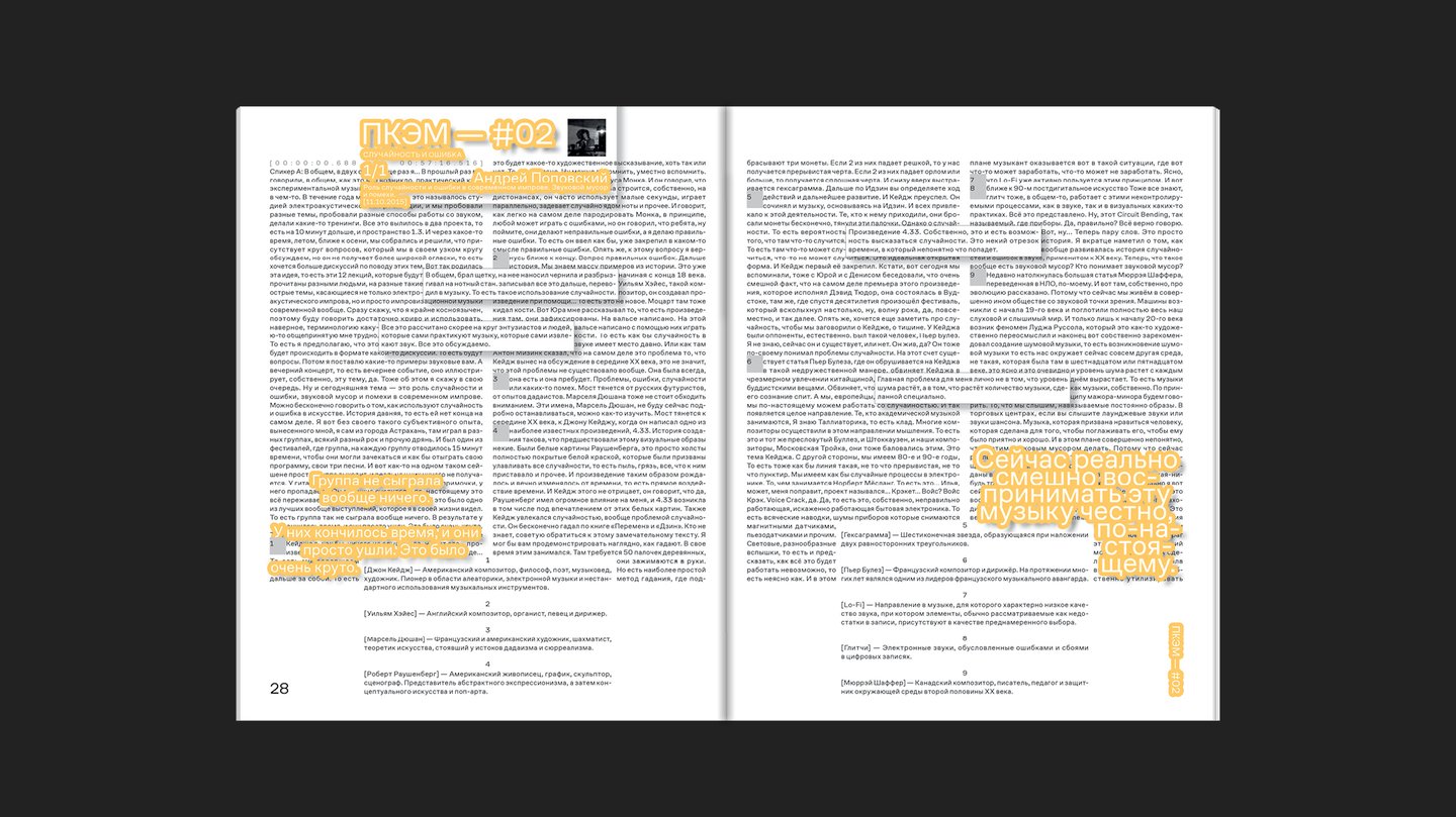 Проект посвящен серии встреч «ПКЭМ» — Практического Курса Экспериментальной Музыки, проходивших в 2015 году в Галерее Экспериментального Звука, в Санкт-Петербурге. Печатное издание собирает в себе тексты лекций, проходивших в рамках курса, не стремясь к документальности и дословности, но обращаясь к духу тех встреч.