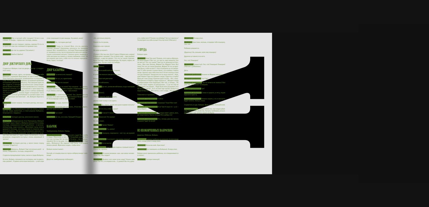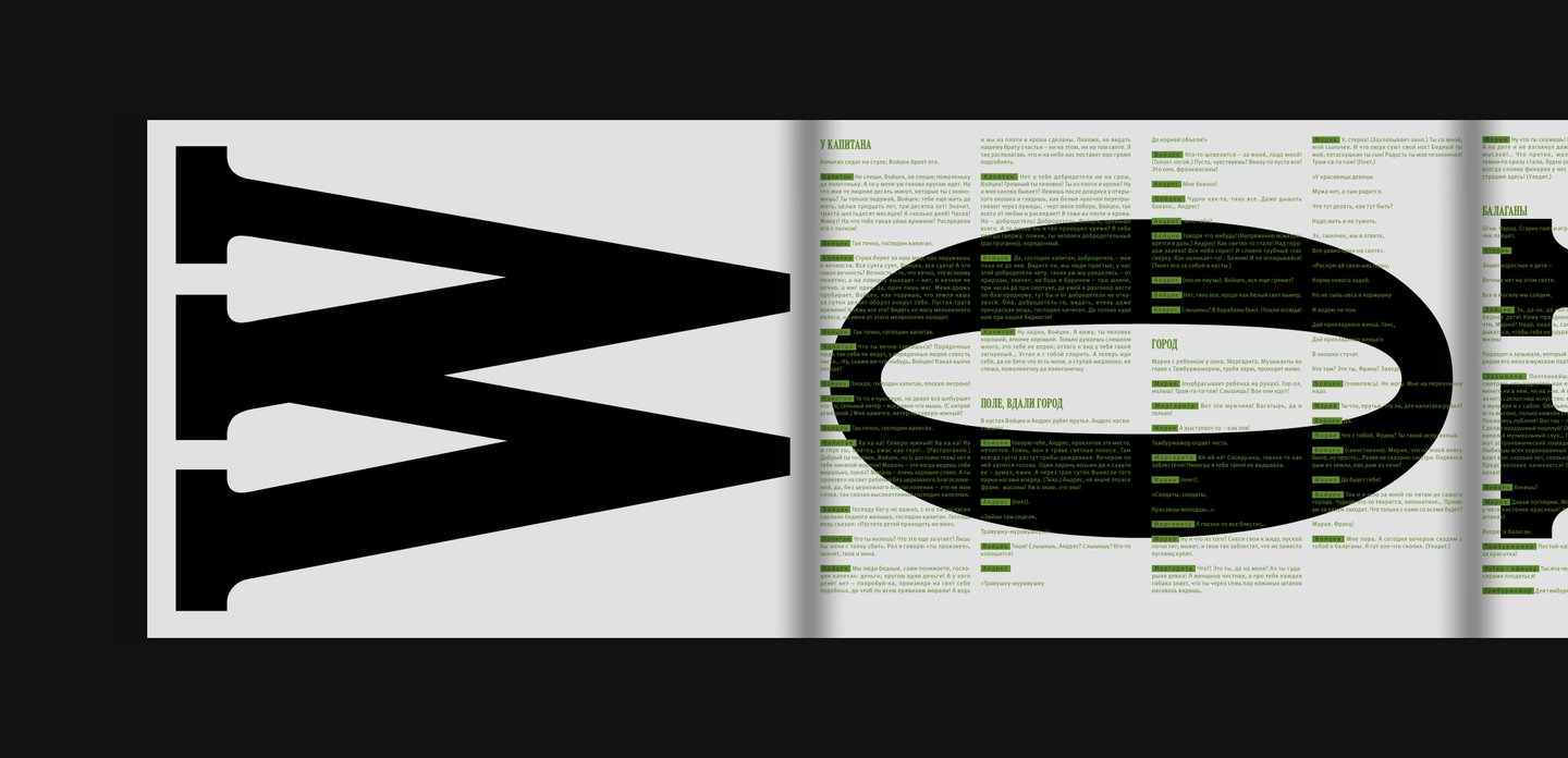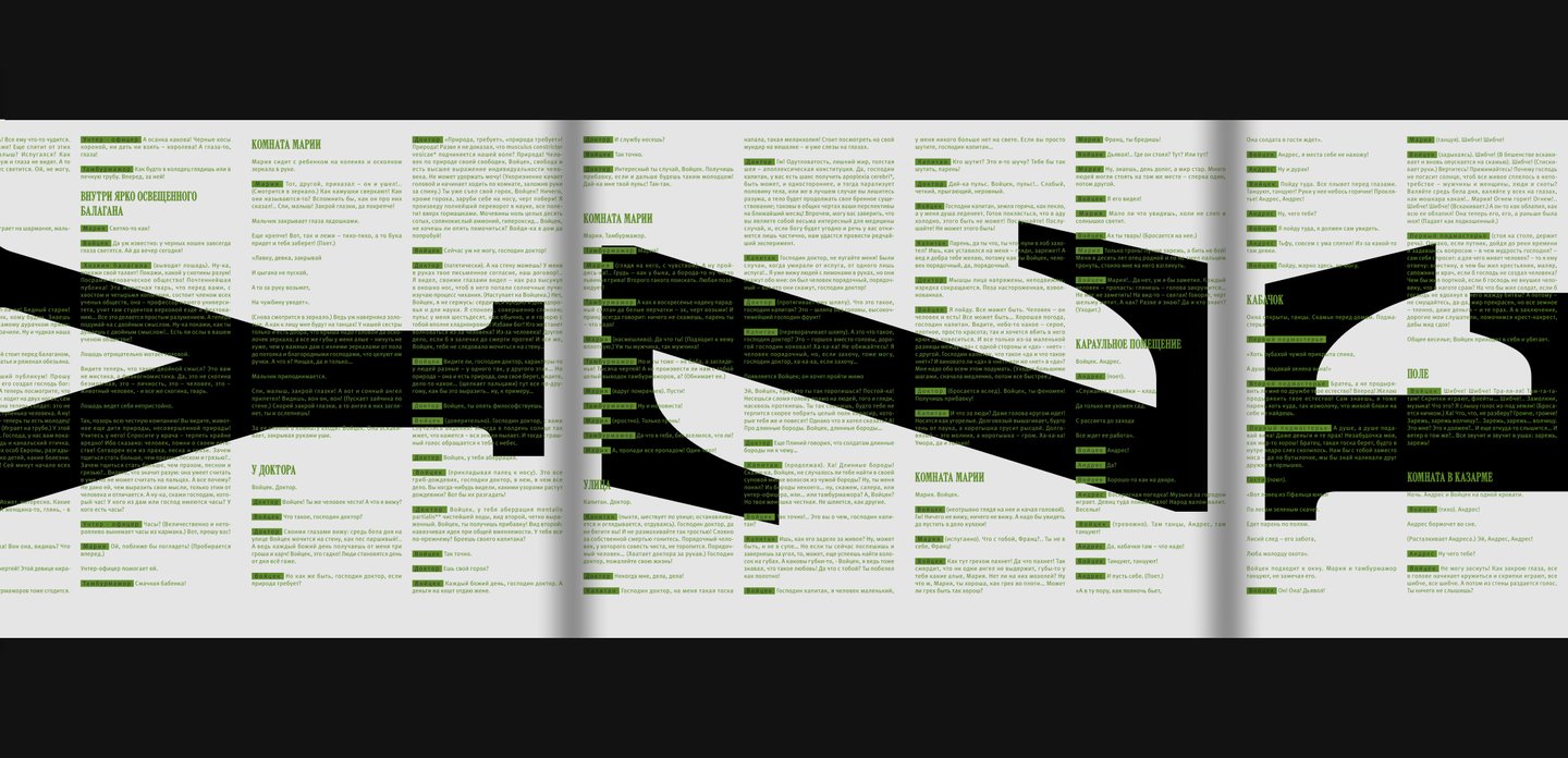 Книга — плакат, сверстанная по трагической пьесе немецкого писателя Георга Бюхнера. Своим характером, пьеса распологает к экспериментам и интерпретациям, поэтому мне захотелось использовать необычный формат.