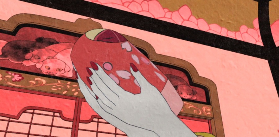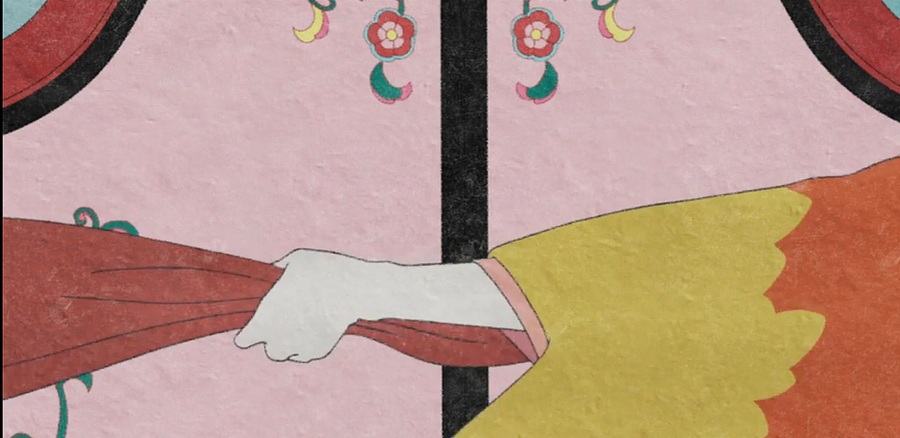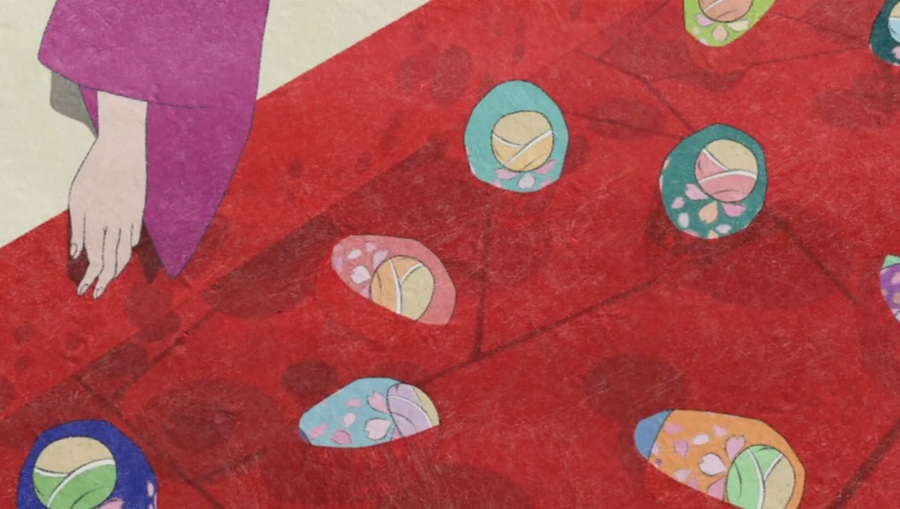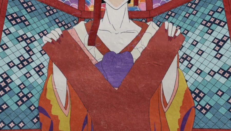 Так, в Мононоке магия заключается в символьных обозначения, которые нам попадаются на протяжение историй. Так, чтобы понять события прошлого, мы должны не просто посмотреть на картинку, но и должны услышать и увидеть ассоциативный ряд между предметами. Например, куклы — дети, ткань — пуповина. Далее нам дают еще больше информации через метафору: ткань рвут, кукол помещают за ширму с огнем, вода краснеет. Это позволяет на более глубоком уровне понять историю, и создать не прямое понимание событий, а дать нам лишь часть понимания, чтобы дальше мы сами могли достроить события, хотя и прошлое от этого все также будет сокрыто от нас.
