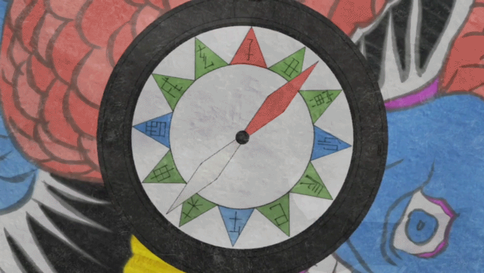 Важно отметить, что знаки могут быть и в самом движение: так, они выглядят более неуловимо и тонко, и мы чувствуем связь между событиями на экране. Так, в «Мононоке», чтобы показать, что мы перенеслись на территорию, где будут происходить мистические события, нам показывают сначала облака, которые медленно накреняются в одну сторону, затем компас продолжает движение, но начинает кач в обратную сторону, а корабль завершает цикл опять поворачивая влево. Движение взято с обычного судного, где нет твердой земли и корабль даже в состоянии покоя будет пошатываться с точно таким же ритмом.