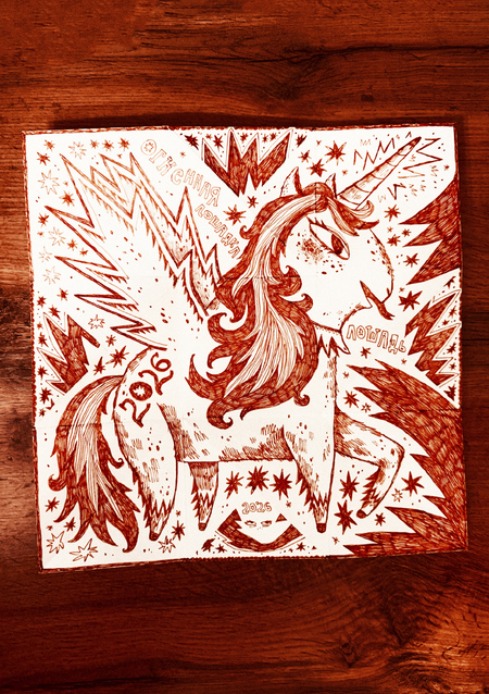 Моя задача состояла в том, чтобы сделать креативную открытку в ручной технике с образом символа 2026 года.