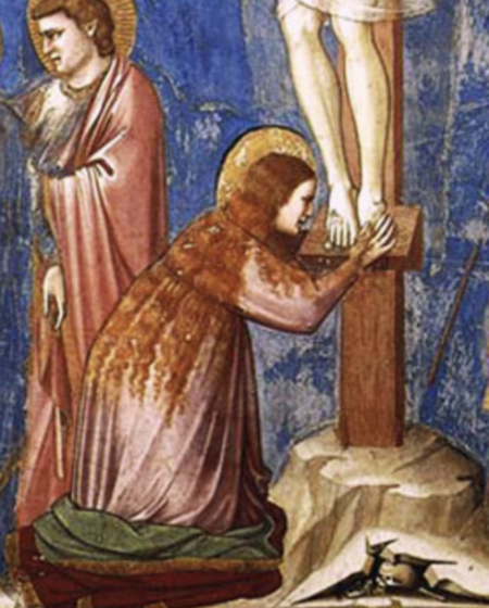 В сценах распятия Джотто Магдалина обычно находится у самого подножия креста. Он передает её эмоциональную вовлеченность через жесты: она протягивает руку к телу Христа, наклоняется вперед, фактически «входит» в пространство страдания.