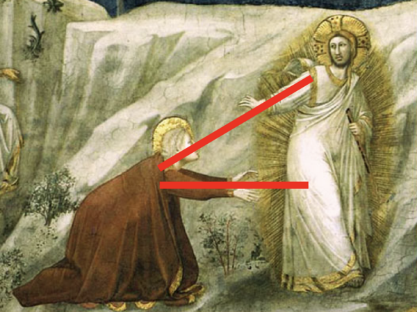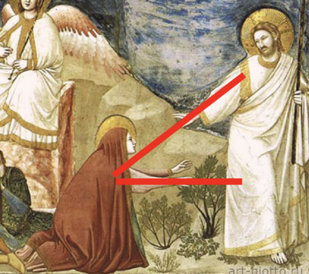 Магдалина приседает, её тело в непосредственной близости, одна рука протянута к Христу — но движение прерывается. Христос демонстрирует небольшое отстранение. Этот момент «почти касания» Джотто передает через диагональ между двумя фигурами. Композиция достаточно точна, чтобы помочь зрителю почувствовать напряжение именно там, где линия движения Марии останавливается.
