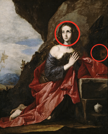 Рибера часто добавляет череп как эмблему размышления, но самое важное — это выражение на её лице. Оно резко очерчено, с напряжёнными бровями, слегка сжатыми губами. Его Магдалина не «восходит» — её Магдалина думает, вспоминает, борется. Это любопытная черта испанского барокко: мало возвышения эмоций, вместо эмоциональных высот — земное приближение.