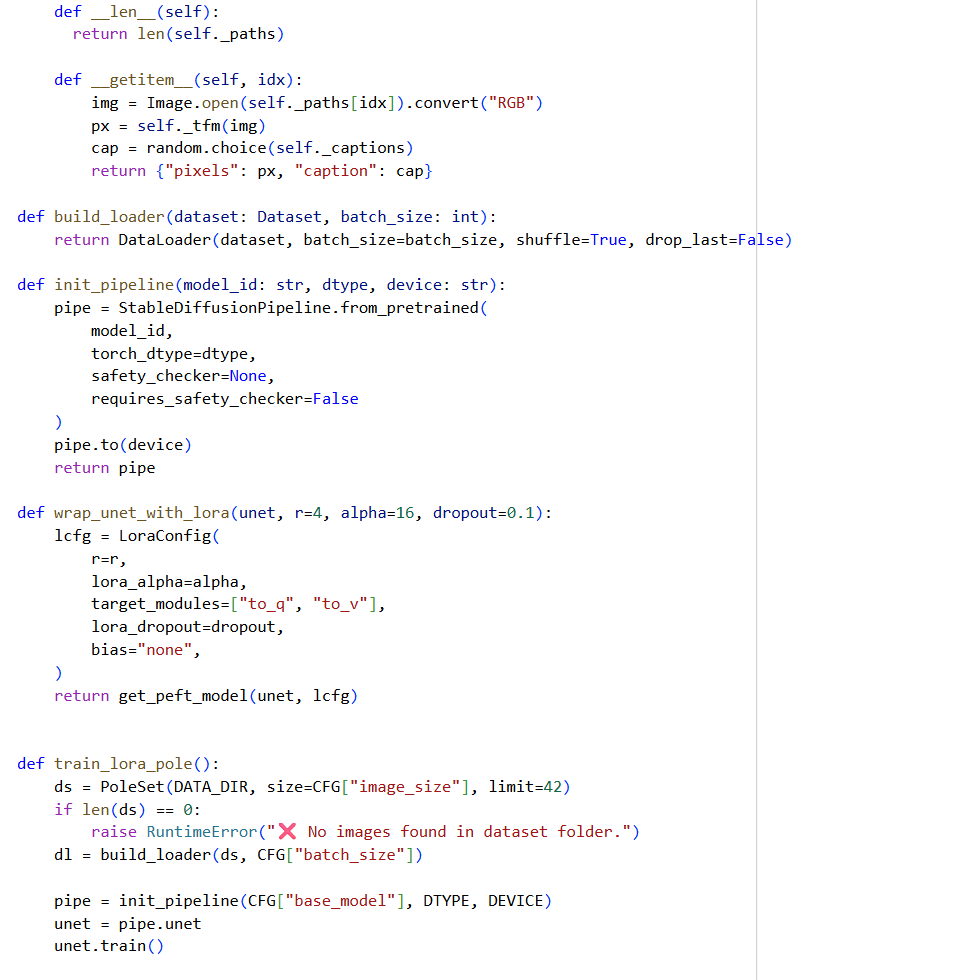 Финал-обучение! Ввела self._captions — список простых «подпись/промпт»-меток, из которых будет случайно выбрана одна строка для обучения (это используется как текстовое условие при обучении LoRA). И сохранила обученную модель на диск.