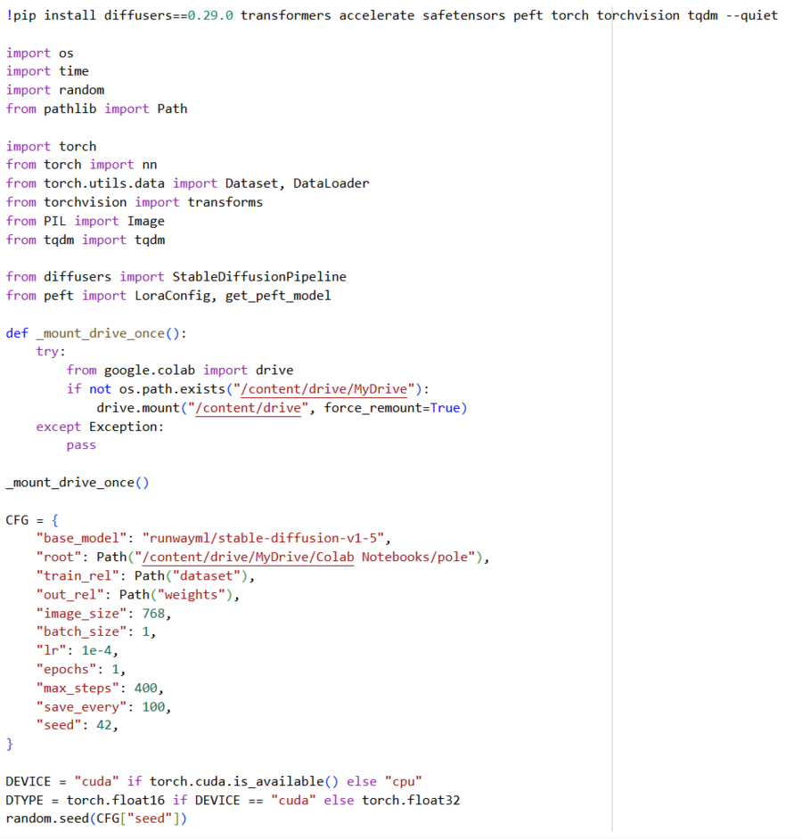 Приступила к обучению модели! Для начала установила нужные для работы с LoRA библиотеки, подключила модули и Google drive. Создала единый словарь для основных параметров. На всякий случай еще раз привела все изображения к единому формату. Установила устройства, провела пути к папкам, настроила поиск в этих папках.