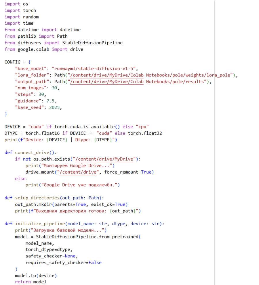 Потом я приступила уже к генерации: собрала все ключевые настройки в одном месте и проверила GPN, подключила Google drive, чтобы скрипт опять все нашел и не потерялся. Далее подключила предобученную модель Stable Diffusion, подключила недавно обученную LoRA, добавила промты.