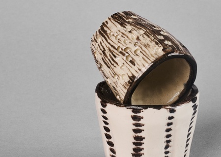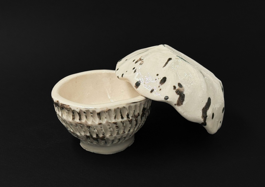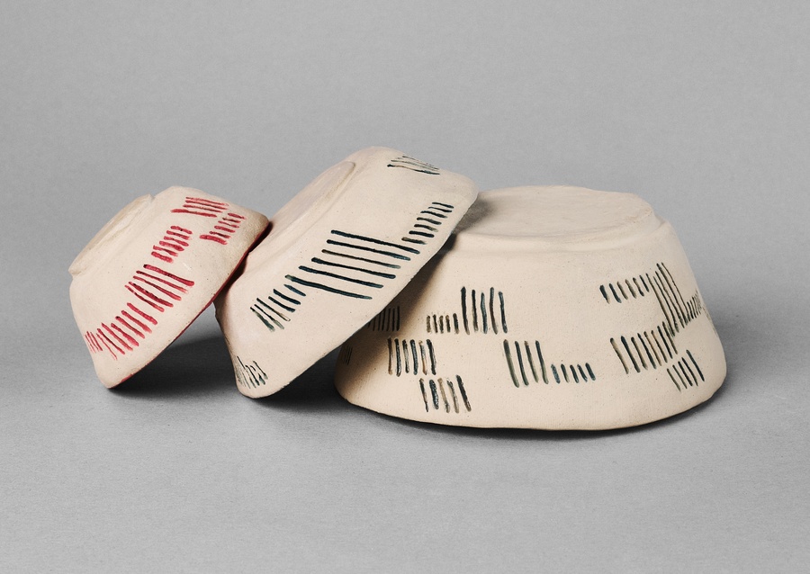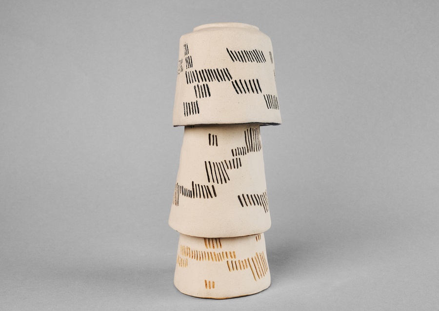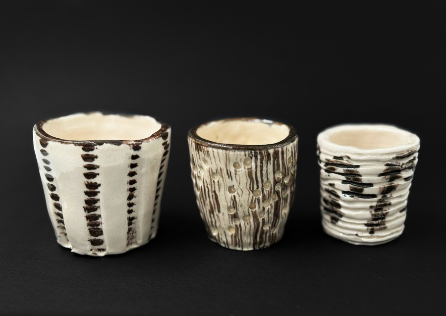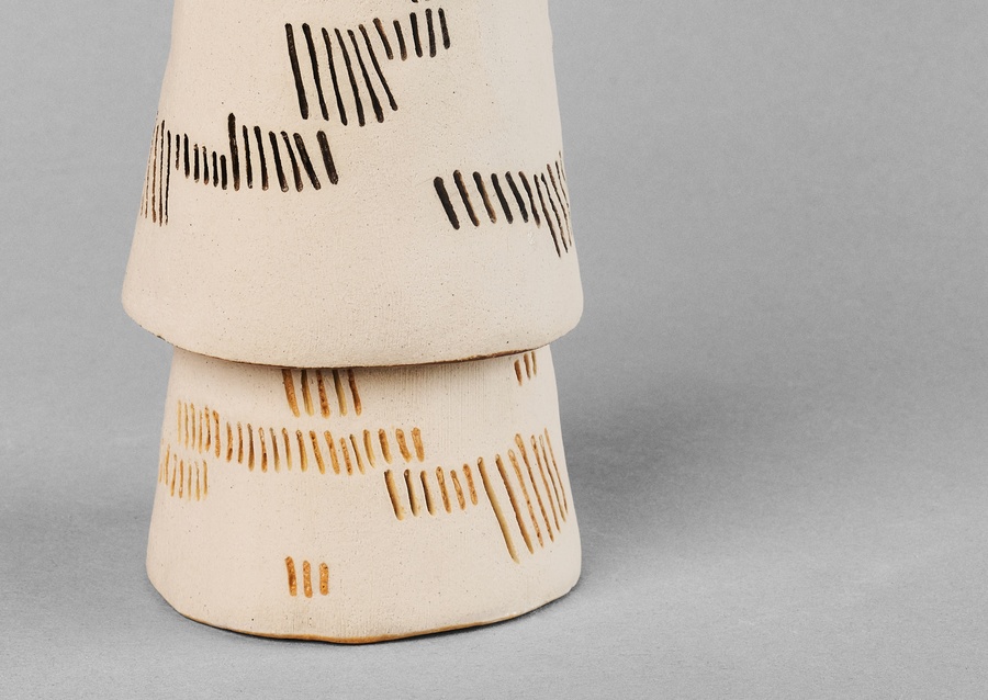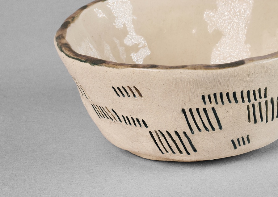 Сначала я формировала форму из кома, затем приступала к созданию паттерна из насечек при помощи палочки. Для покрытия изделия ангобом я также нашла технику. Нужно выждать время, чтобы глина высохла, и только тогда я начинаю работать с цветом. В получившиеся бороздки я аккуратно наношу ангоб, а потом при помощи скальпеля сцарапываю оставшуюся на изделии глиняную краску. Так цвет остается только в бороздках. Покрывала глазурью также не полностью, а только изнутри, чтобы сохранить текстуру керамики.