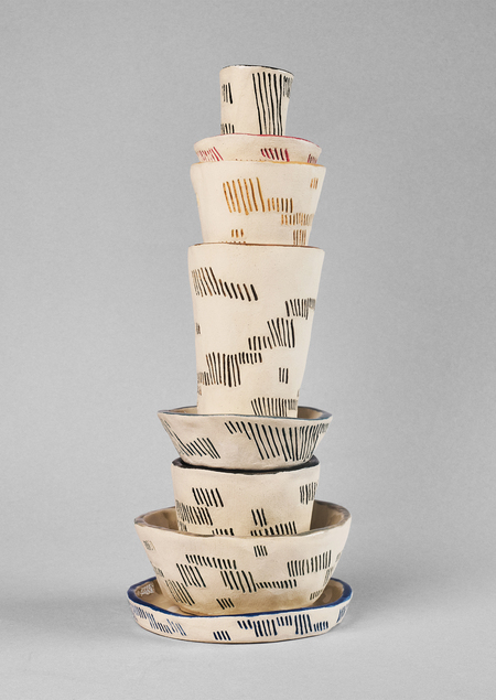 Это минималистичная серия посуды, где главный акцент сделан на тактильных ощущениях. Повторяющийся паттерн нанесен на место естественного хвата. Посуда сочетается друг с другом как функционально, так и визуально. Паттерн является связующим звеном, который позволяет предметам жить вместе в разных комбинациях. Рисунок отсылает к «потоку» — это состояние полного погружения в процесс. Паттерн в этой серии — это не статичный рисунок, а воплощение движения.