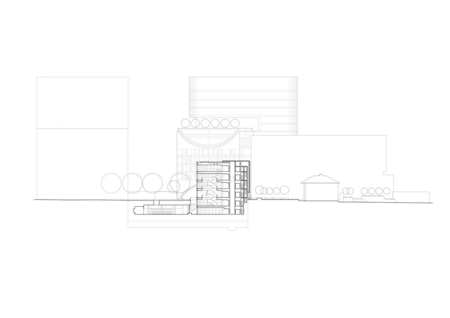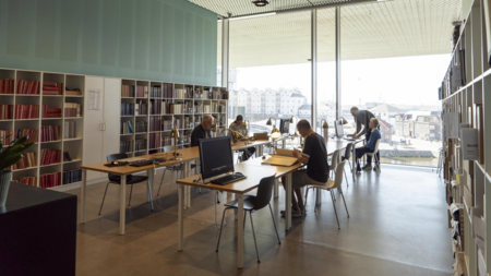 2) Библиотека/читальный зал. Представляет собой пространство без хранилище, которое вынесено в отдельное здание. Для доставки используется транспортировочная подземная система, позволяющая эффективно использовать малые пространства.