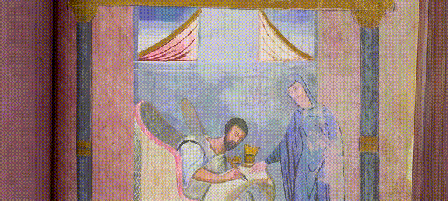 Фоны пурпурные здесь письмена золотые покрыли; Алою кровью гремящего царство открыто небес; Радости райские нам звёздный чертог обещает; В ярком сиянье торжественно слово Господне блестит. Божьи заветы, одетые алыми розы цветами, Нас сопричастными делают таинству крови Его. В светлых же золота искрах и нежном серебряном блеске К нам нисходит таинственно белое девство небес…