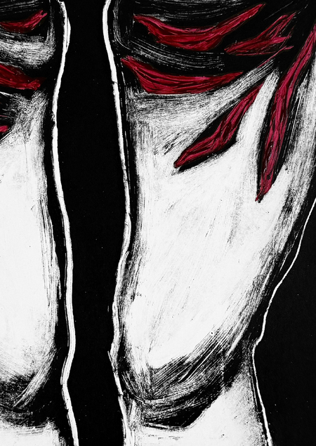 РАНЫ — это тактильные образы тела, созданные в технике монотипии. Объемные акриловые элементы визуализируют раны как чужеродные, но неотъемлемые части плоти. Контраст фактуры отпечатка и рельефа краски создает физическое переживание темы