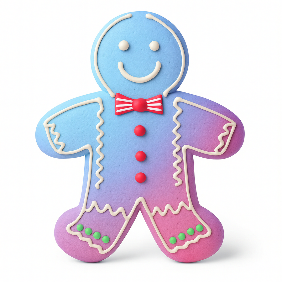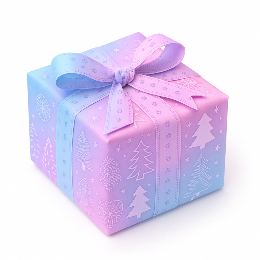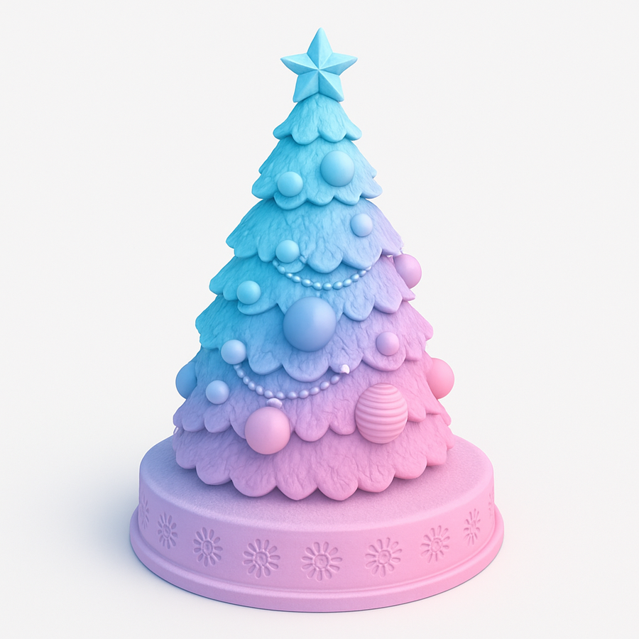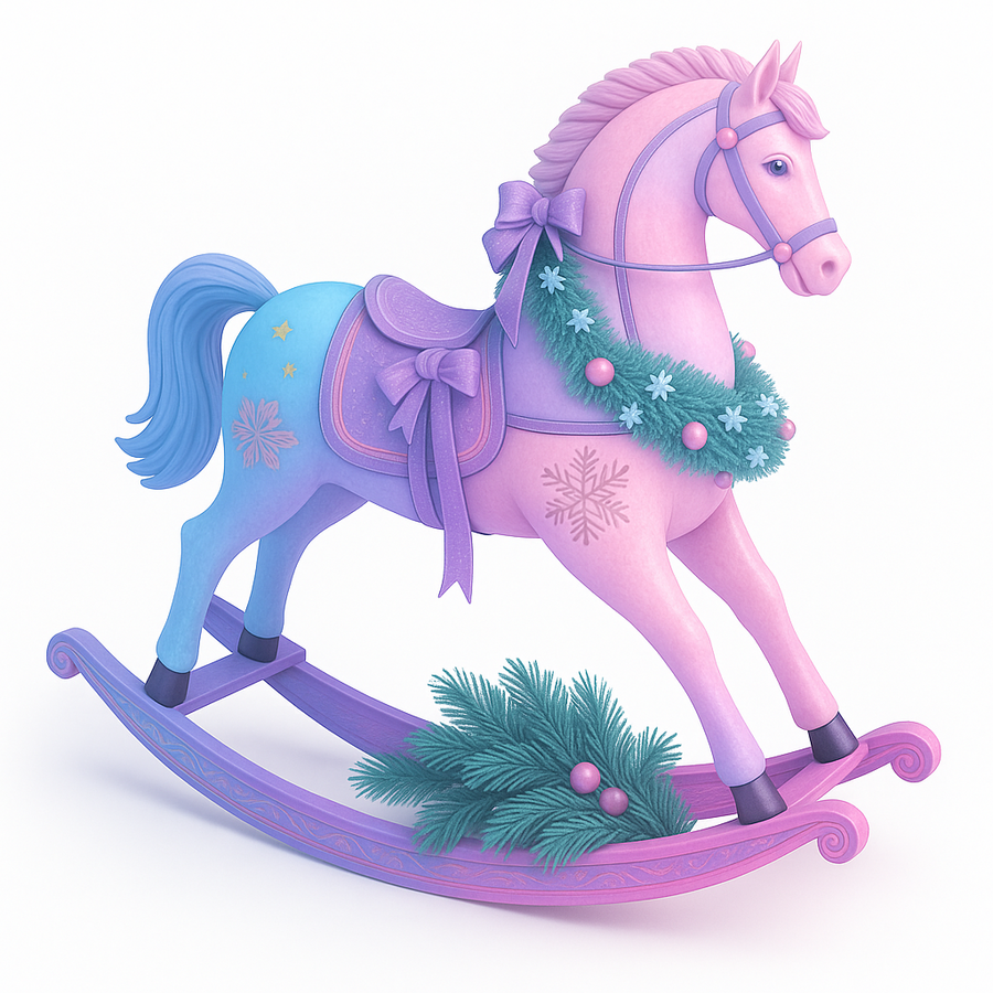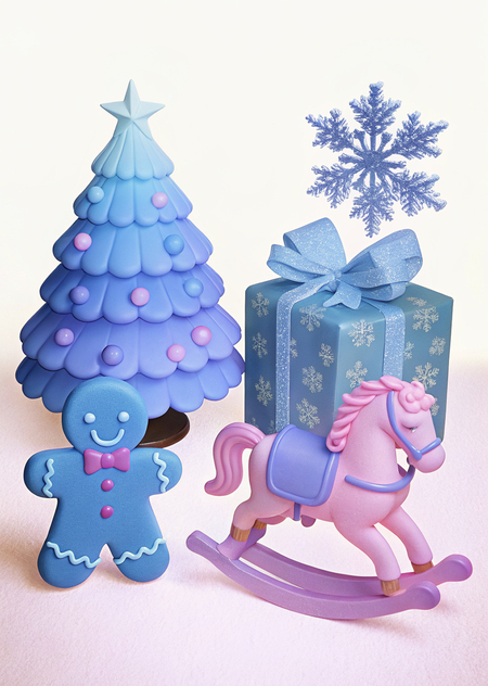 Проект представляет собой серию изображений новогодних игрушек, созданных в едином стиле с использованием нежной пастельной цветовой палитры и плавных градиентов от голубого к розовому. Основная цель проекта — визуально выразить атмосферу праздника, уюта и волшебства, используя традиционные новогодние символы: ёлку, подарки, пряничных человечков, рождественскую лошадку-качалку и снежинки.