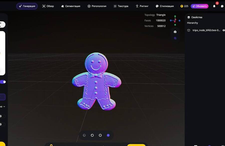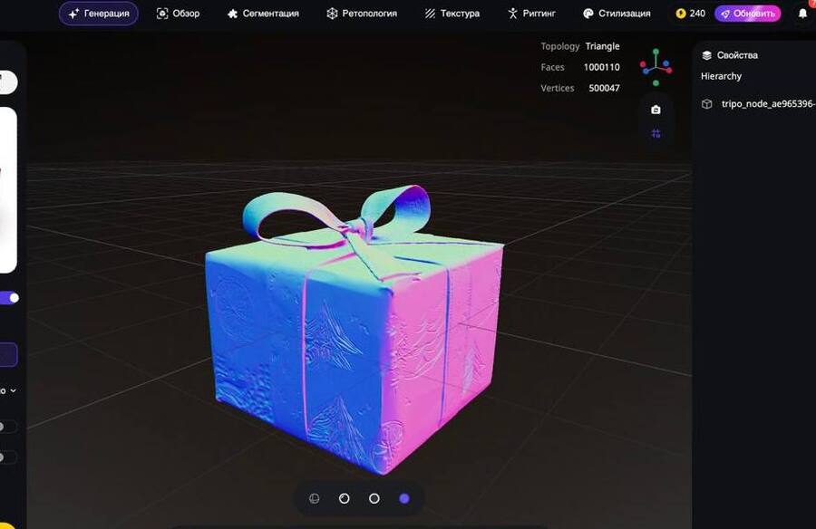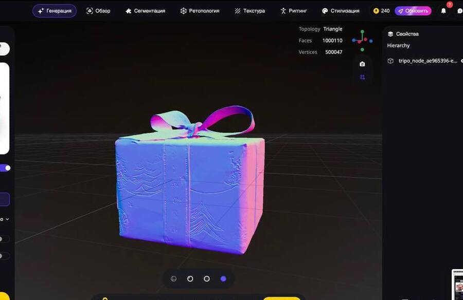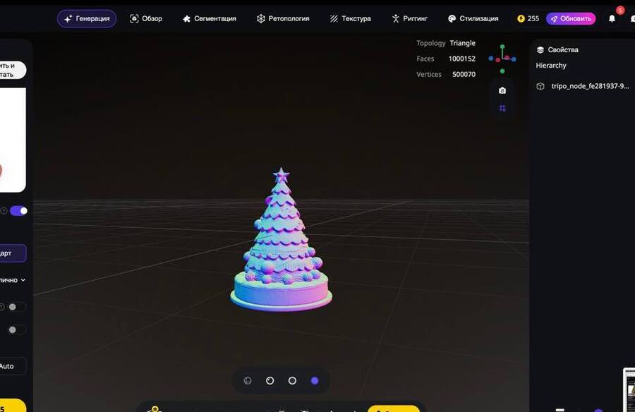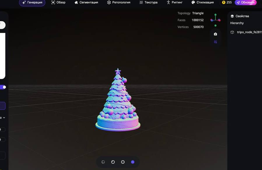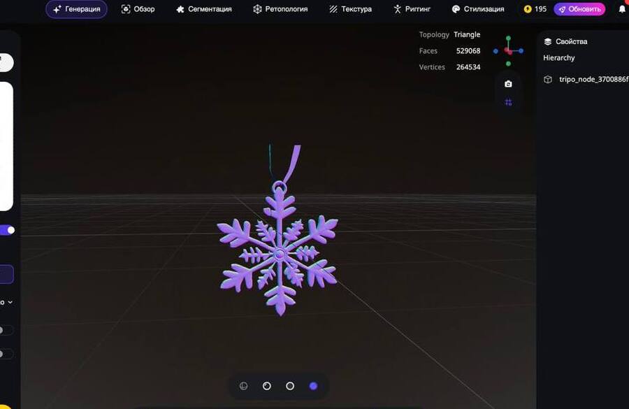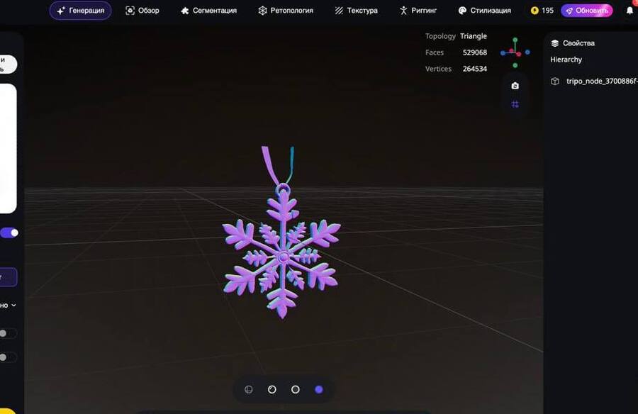 Далее через нейросеть по созданию 3D фигур по фото Studio.tripo3d были созданы 5 3D моделей фигур новогодних игрушек.