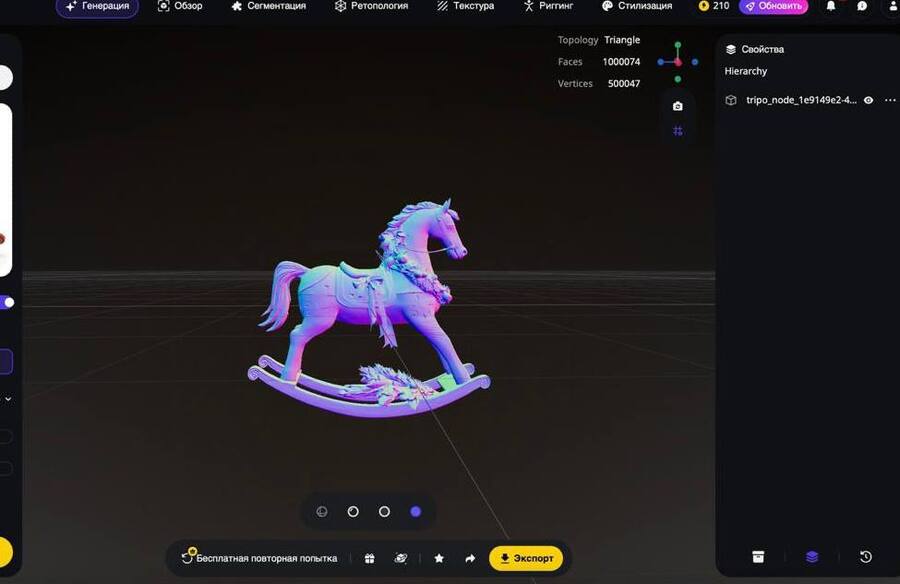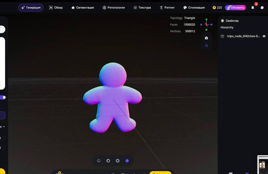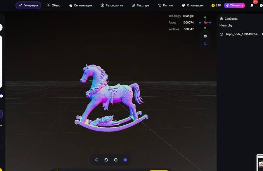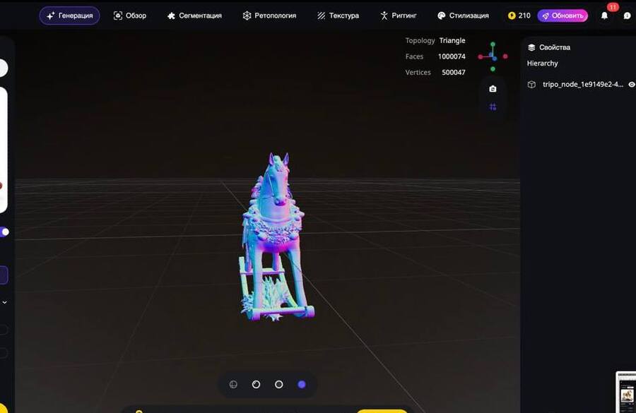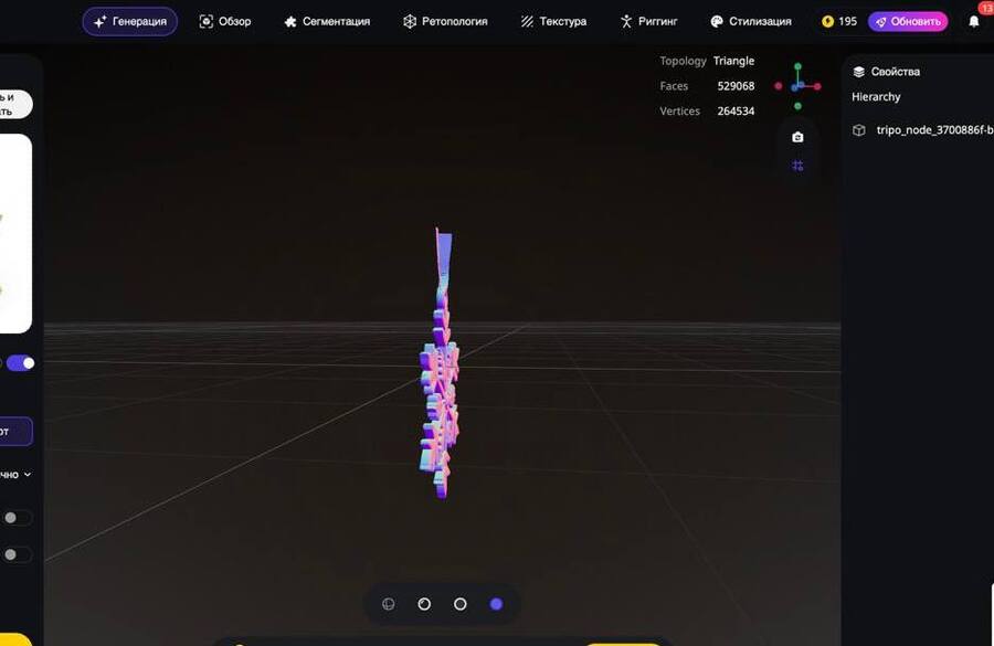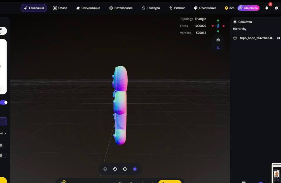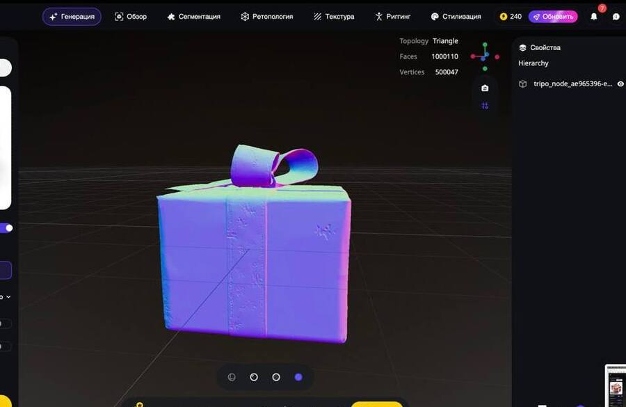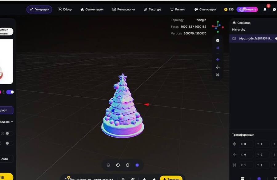 Далее через нейросеть по созданию 3D фигур по фото Studio.tripo3d были созданы 5 3D моделей фигур новогодних игрушек.