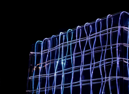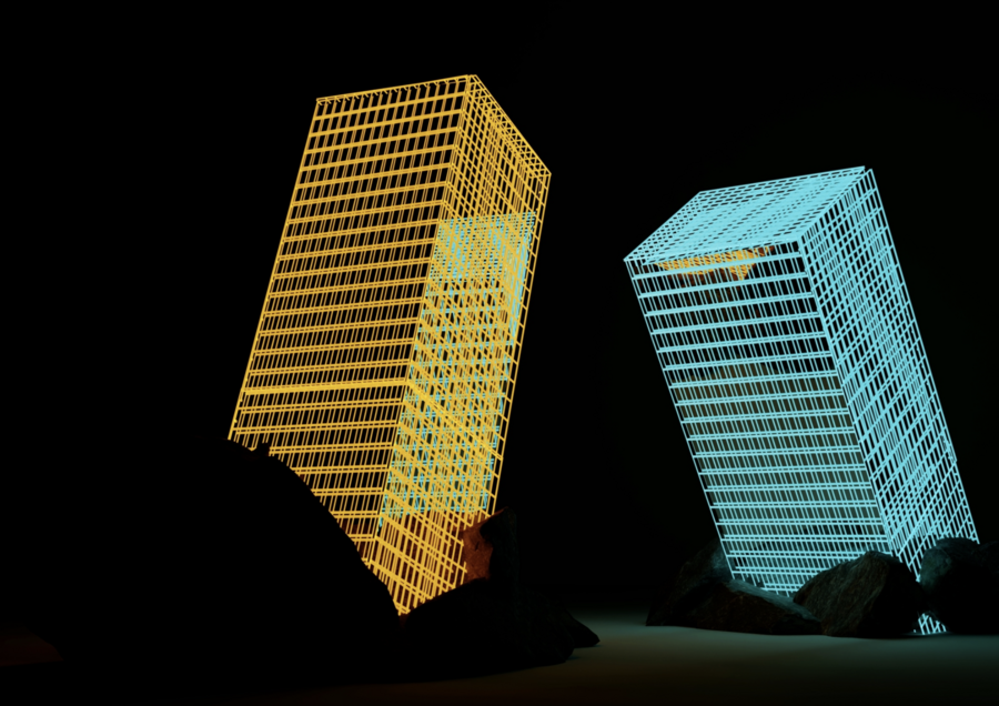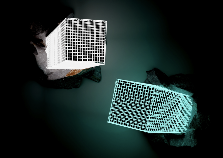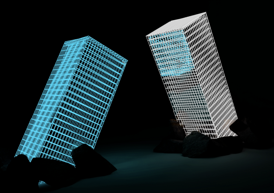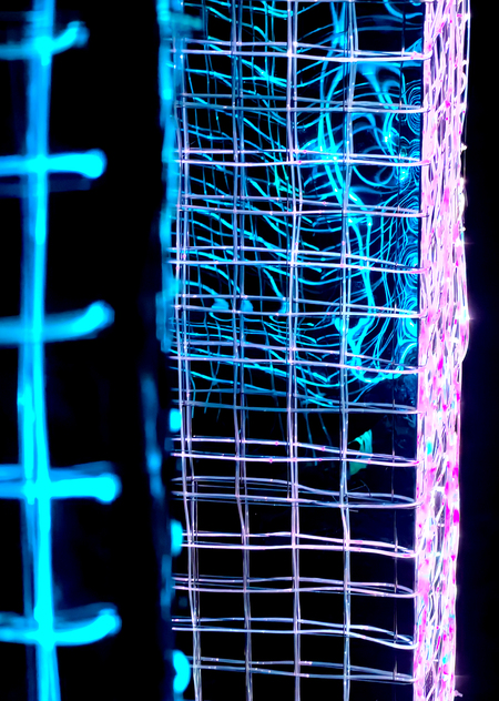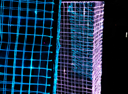 На полное изготовление инсталляции и ее установку потребовалось 4 дня непрерывной работы. Каркасы представляют собой сваренные металлические конструкции высотой 170 см и 220 см, оббитые специальными отражающими плотными пленками, идеально имитирующими зеркальное покрытие. Сверху на покрытие была «надета» оцинкованная сетка, согнутая как чехол для конструкций. Далее сквозь сетку было проведено бесчисленное множество нитей светящегося оптоволокна. С помощью заданных направлений удалось воссоздать полноценную светящуюся сетку, похожую на голограмму, цвет которой можно было менять с помощью настраиваемых пультов.