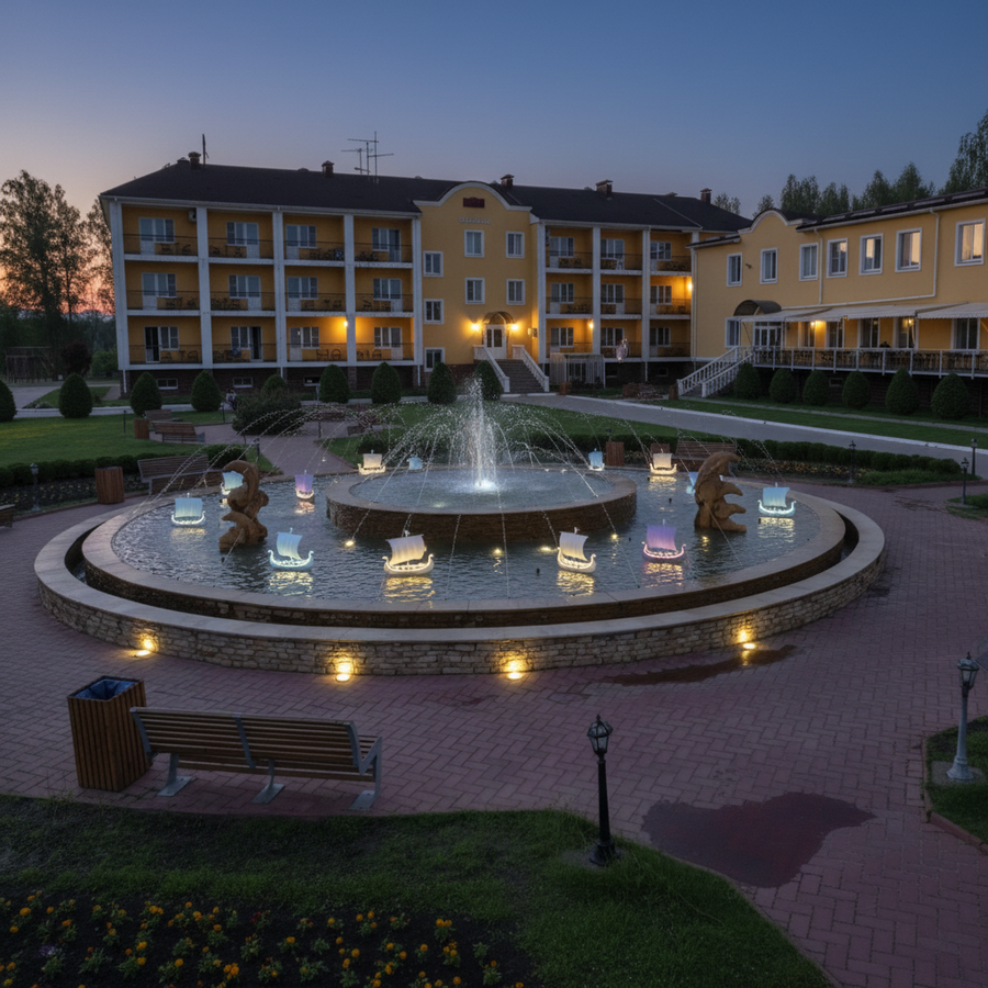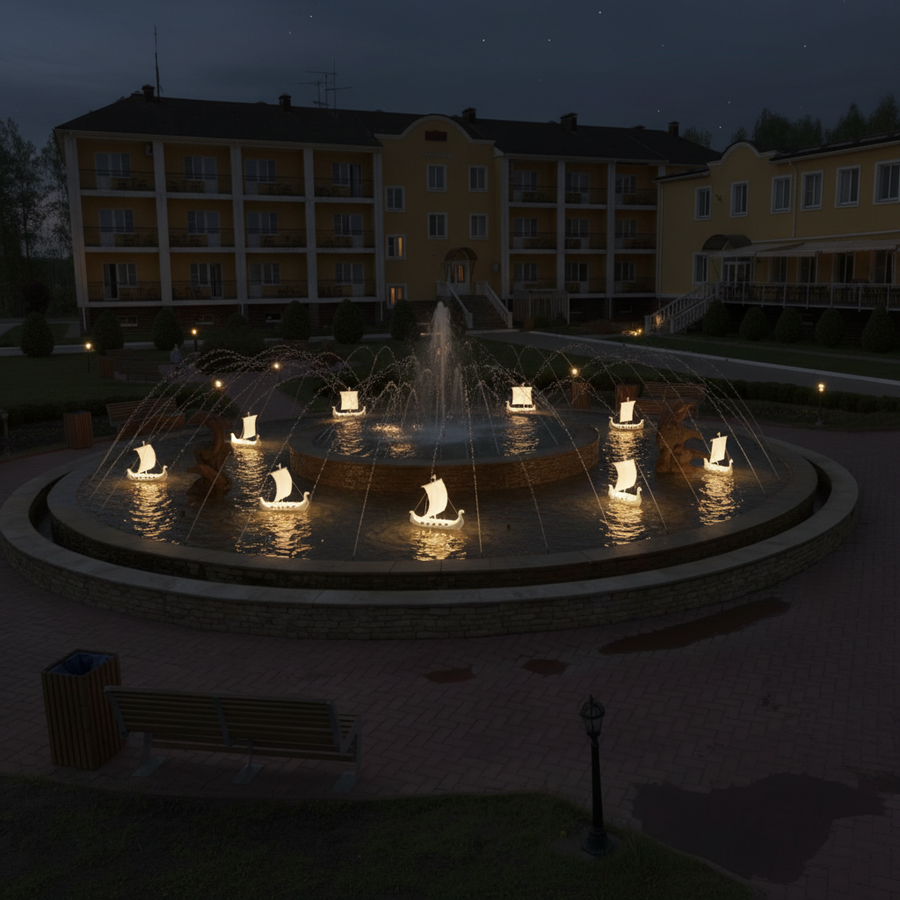 Фонарики в фонтане символизируют корабли Садко и отражения подводного царства. Переливы синего, белого и золотого света передают движение волн и атмосферу сказки, превращая фонтан отеля в живую иллюстрацию легенды о музыке, воде и вдохновении