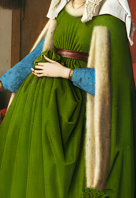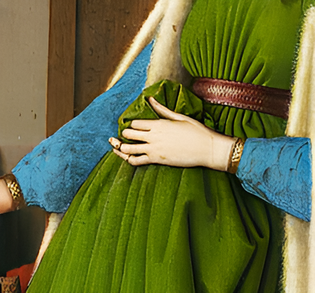 Этот подход отлично согласуется с нормами культуры бургундского двора и состоятельного бюргерства, для которых публичное выражение богатства являлось частью социальной репрезентации и власти. Ткань в этом образе — медиа, на котором написана история социального положения, и именно через этот визуальный язык van Eyck передает особенности эпохи, становясь своеобразным хронистом общественных отношений посредством изобразительного искусства.
