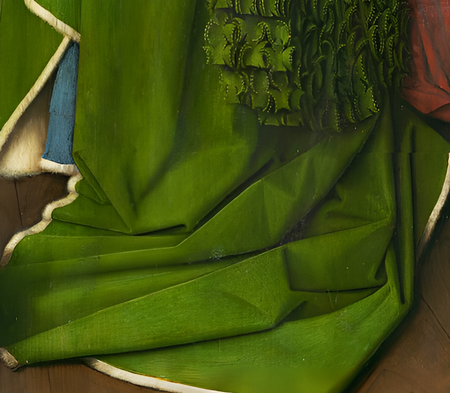 Ван Эйк — это мастер, который умел не только фиксировать физическую текстуру ткани, но и создавать у зрителя ощущение глубины и объема благодаря искусному использованию светотени и световых эффектов. Для достижения этого он широко применял технику многослойных лессировок, придававших ткани натуральное сияние и живость. Свет в его картинах словно пронизывает поверхность ткани, выделяя каждую складку и ворс, при этом аккуратно моделируя формы и создавая иллюзию материальной плотности.