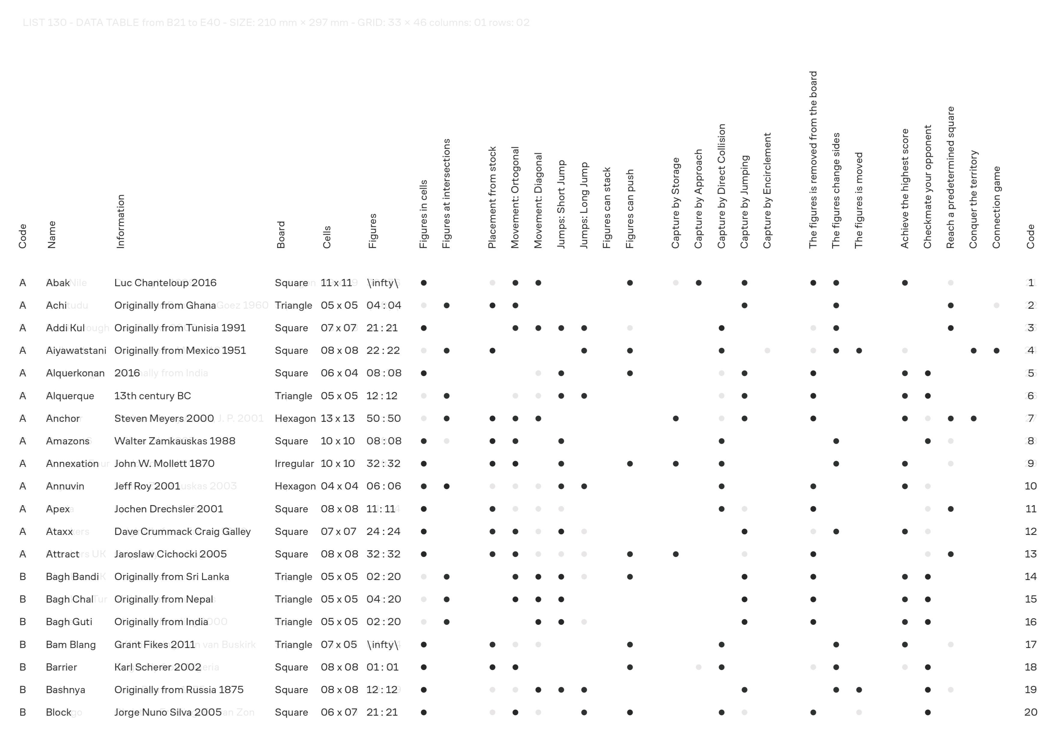 По вертикали — собраны все игры, рассматриваемые в этой работе. Такой формат позволяет рассмотреть как бы «сверху» механизм составления большей части известных нам игр и понять какие элементы игровой структуры используются повсеместно, а какие могут быть исключены.