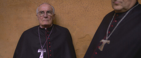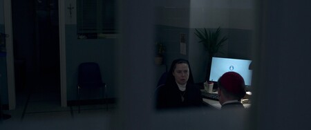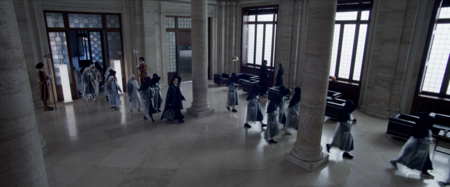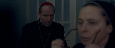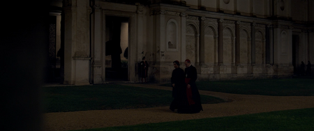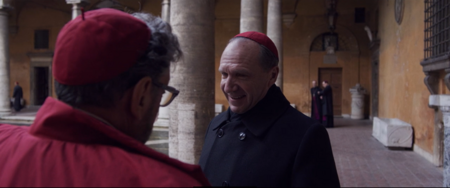 Тут контрастная одежда монахини играет ключевую роль. Она ярко выделяется на фоне красных одеяний кардиналов, словно погрязших в их кровавой битве. Агнес с железным спокойствием заявляет, что «у монахинь есть уши и глаза» и они тоже имеют право голоса. Она обвиняет Трамбле в манипуляции и удаляется.