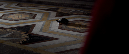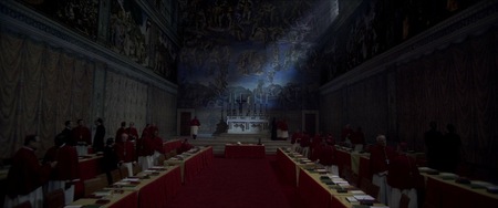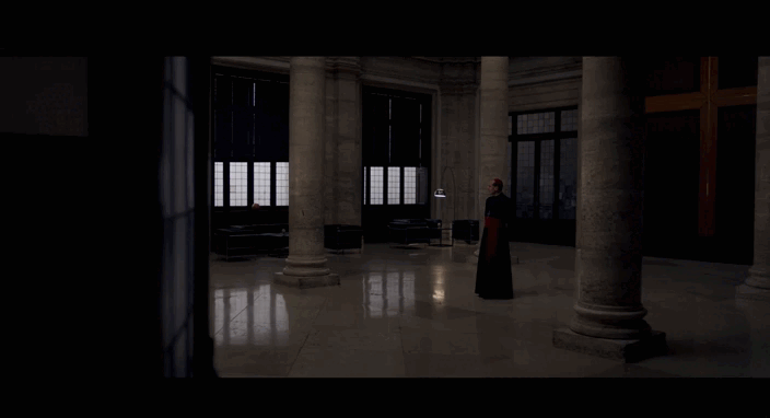 Слегка зажатая композиция кадров и тусклое освещение созданы режиссером специально, чтобы зрители ощущали себя невольными наблюдателями за действиями кардиналов. Мы не участники этих событий, мы не можем узнать, о чем думают и какие тайны хранят церковные служители, но при помощи антитезы мы в состоянии противопоставить их действия, желания и мотивы друг с другом.