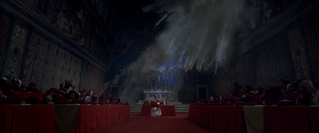Градация мрака с течением фильма возрастает, поскольку ситуация накаляется. И на предпоследнем дне конклава напряжение доходит до предела и окна Сикстинской Капеллы взрываются из-за проходящих на улице Ватикана терактов, позволяя лучу света озарить главный зал, где проходят выборы.