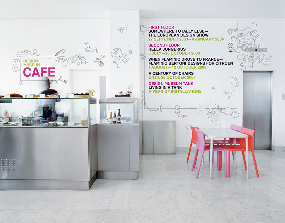 В кафе Design Museum минимализм проявляется как продуманная комбинация воздуха, света и структурной линии. Графические элементы аккуратно маркируют пространство, превращая зал в часть единой айдентики. Такая визуальная легкость обращается к «интуитивному» психотипу зрителя: не объясняет, а намекает. Минимализм здесь является способом создать атмосферу открытости.