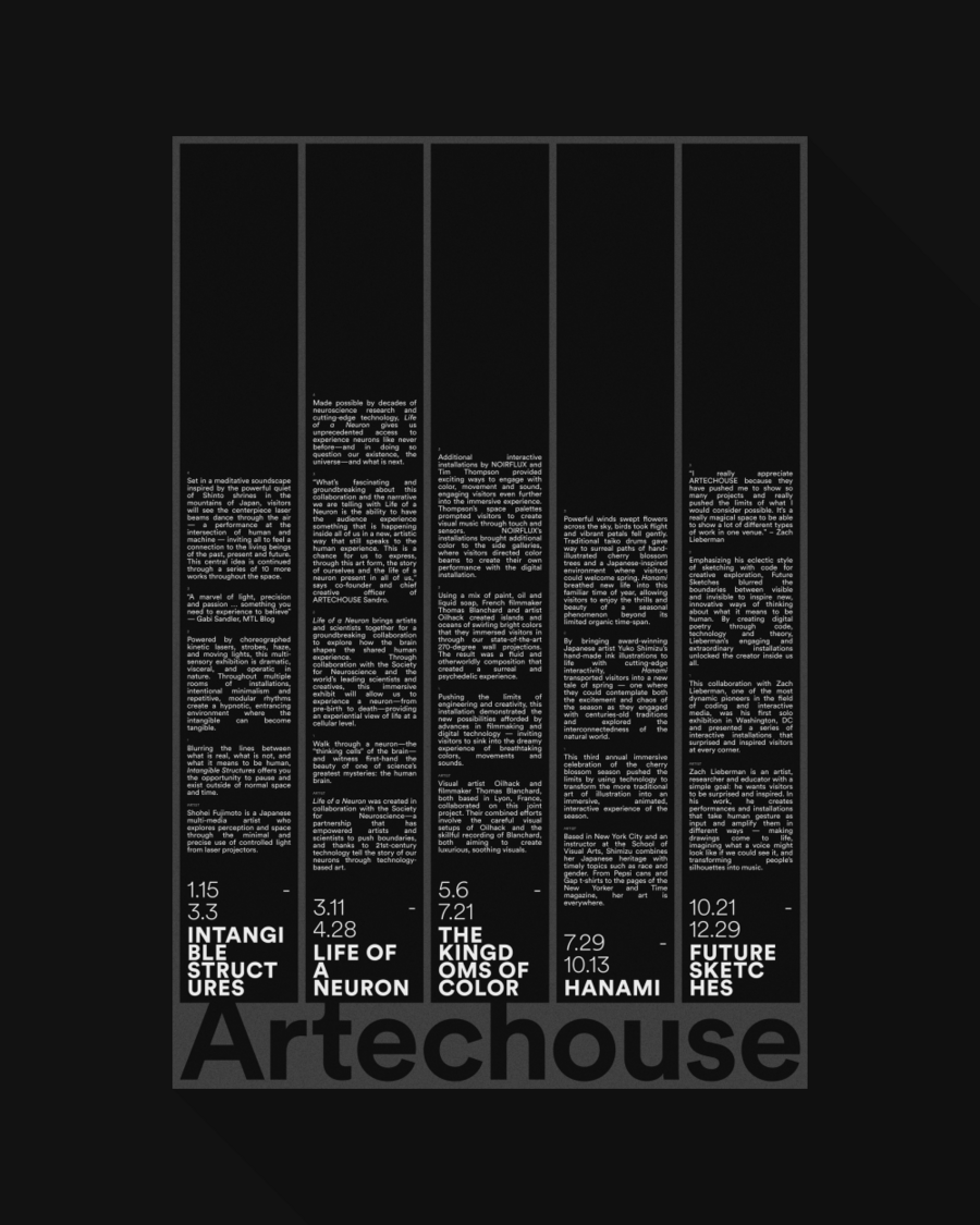 Минимализм ARTECHOUSE работает как визуальный маркер доверия: чистая типографика и строгие плоскости подготавливают зрителя к технологически насыщенному опыту. Логотип, выстроенный на идее «нового Возрождения», связывает искусство и науку и задаёт ощущение интеллектуального пространства. Спокойная визуальная рамка удерживает фокус и не конкурирует с цифровыми инсталляциями. Зритель чувствует порядок, компетентность и уважение к его вниманию.